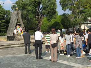今天打算去长崎 的平和公园 (Peace Park)。平和公园是为了纪念1945年8月九日,美军向日本发动攻势,丢下了原子弹,摧毁了当时的长崎与无辜的人民。公园附近的大草场便是灾难原址。在平和公园时,有几组的学生在那默哀,并献上纸鹤,祈求和平。