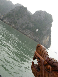 在这2日1夜的下龙湾,只有我与另一家三口四名游客。这一家来自 New Caledonia。是个小岛国,位于澳洲与纽西兰之间。听他们说那里有细如盐的白色沙滩,清澈如镜子的海,美丽的珊瑚礁,很适合潜水,甚至比著名的马尔代夫与毛里求斯还要美丽!! 哇哇。。有机会我也想去呀。他们不韵英语,常用语是法语,所以我们之间也无法聊得太深入。可是在一起用餐时,我们还是用了半咸又烂的英语加比手划脚地聊着,嘻嘻哈哈地叙述各自的旅游经并愉快用餐。对他们的印象堪好,妈妈是个活泼又健谈的老师,爸爸即含蓄又风趣,而且还长得有点像 George Clooney呢! 女儿今年14岁了,是个可爱漂亮的女生。这一次他们趁着学校寒假,来到越南旅游3个星期。。。已去了胡志明市 (Ho Chi Ming),Danang, Dalat,, Nha Thrang。。。下一站便是萨葩 (Sapa) 然后便回国了。啊。。。真羡慕啊。。。