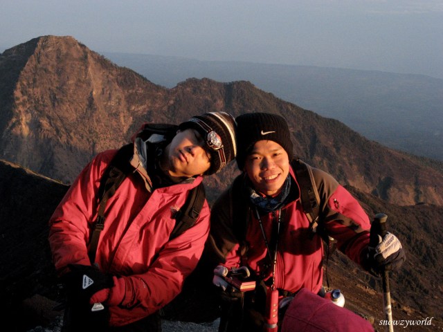 It was funny actually, other than Samon and myself, there was nobody in sight. Where’s the rest of the trekkers who had earlier overtook us? Did they not make it to the summit? I don’t recalled many people coming down while I tried to go up. Anyway… by than Yin, Mike, Zhix, Wz and Tony arrived with the triumphant and relieved grin on their faces. Especially Zhix & Mike, they were really enjoying by becoming cam-whore at the summit. Oh, oh… and thanks to Zhix & Mike for carrying up the Soju and shot glasses, who all had a celebratory toast at the summit… Cheers!