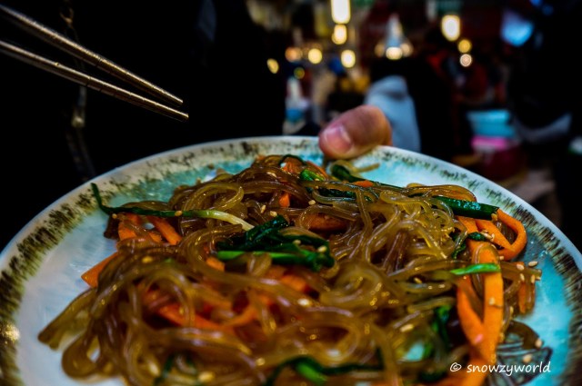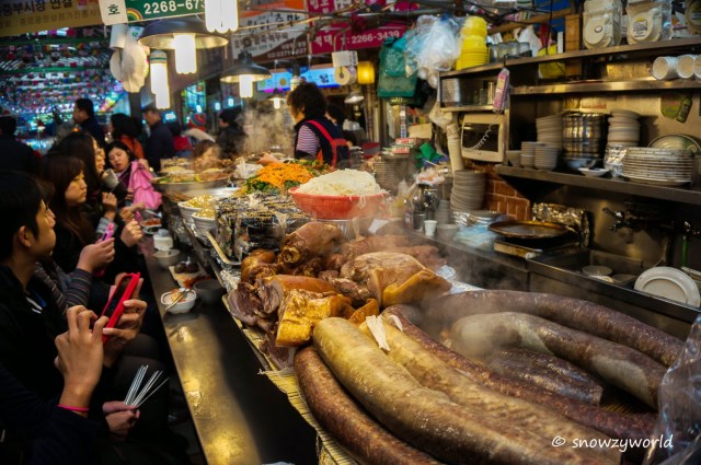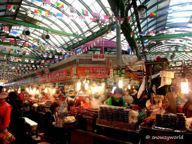2 criss-crossing corridors are the booths and stalls selling variety of Korean street foods like the Bindaetteok, Gimbap, etc. The market is bustling with activity where Korean workers flock to the market all year round to sit at the benches lining each stall to eat.