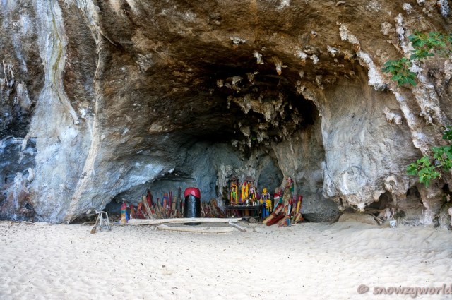There’s a shrine at the cave which was located on the east side of the Railay Bay. Since ancient times, fishermen before going out to sea, made offerings to the Phallus of Shiva at the cave, said to bring them success in their fishing and protect them from danger. The cave contains a large collection of carved wooden phallic symbols… hmmm….