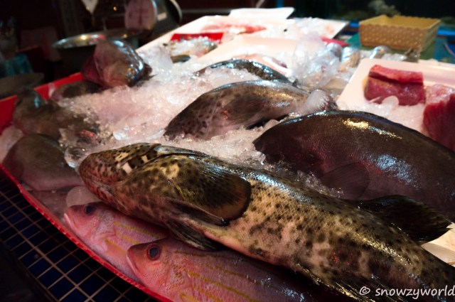 Bought these as a set for 1000B for a whole fish, clams, exchanged 2 sotongs for 2 extra big prawns. Nicely grilled, and the prawn and fish meat tender and sweet.